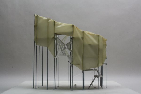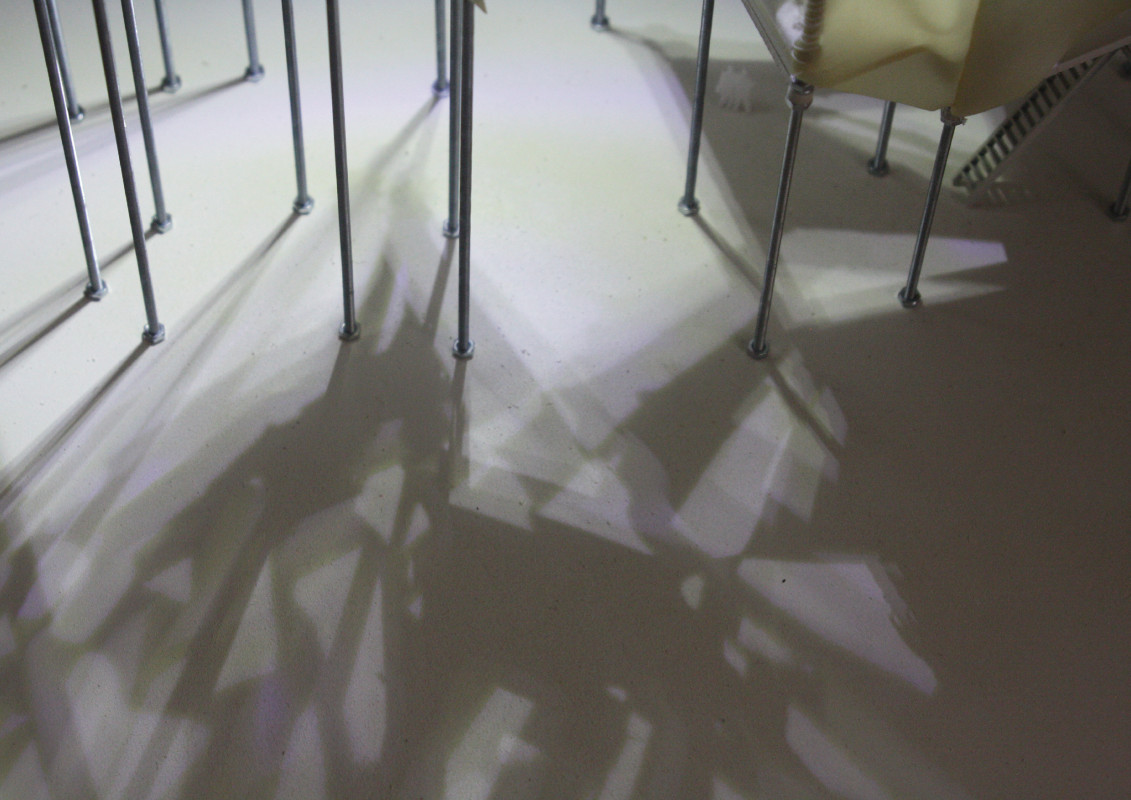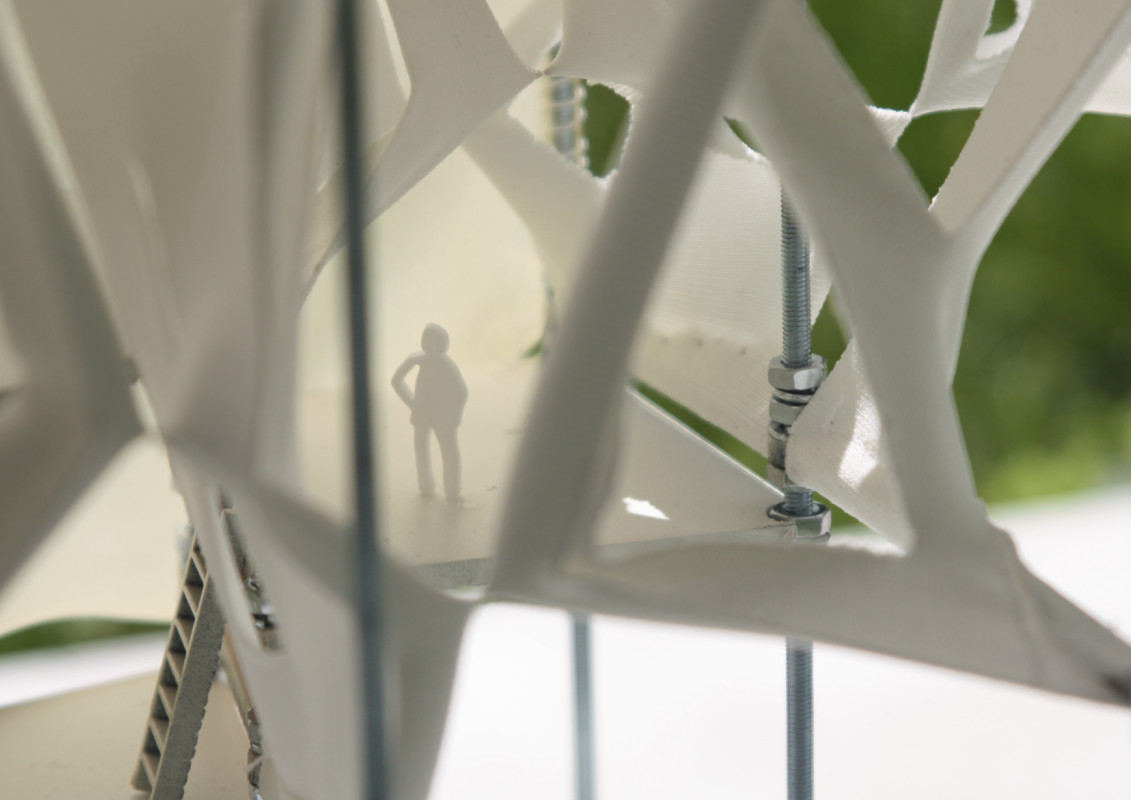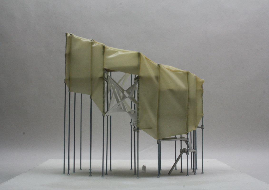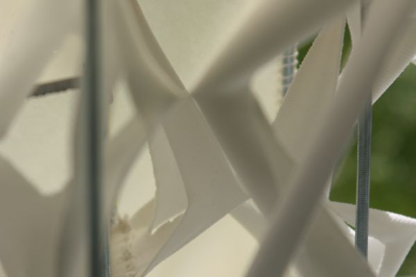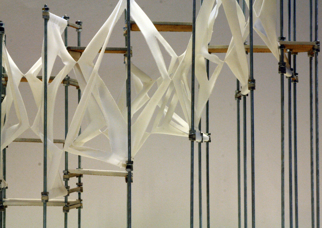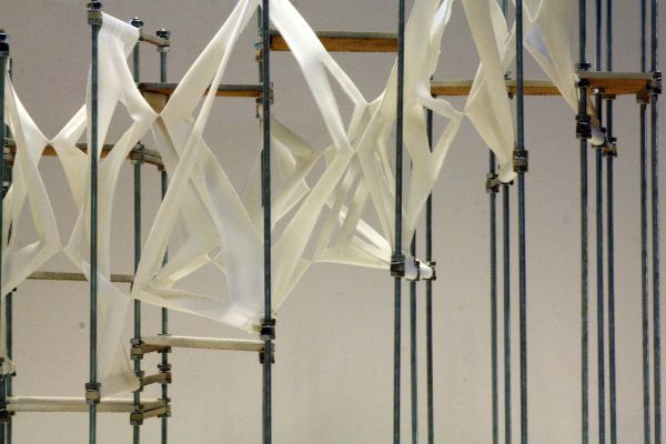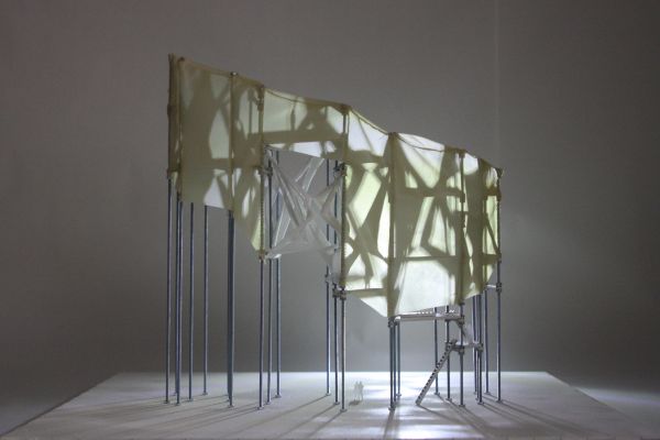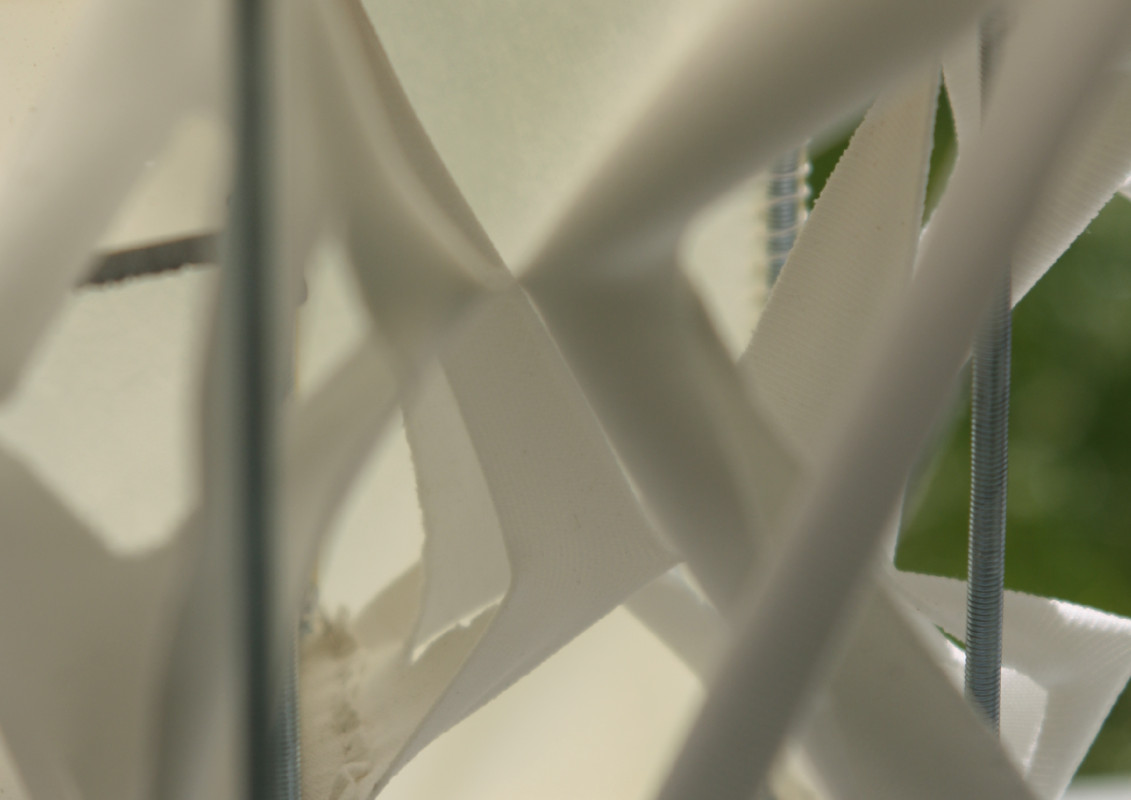 Am Ende einer Vielzahl von Modellstudien steht eine begehbare Struktur im Wald. Zwischen vertikalen Rundrohren spannen sich Stoffbahnen auf, die durch punktuelles Vernähen miteinander verschmelzen. Die seitlich angeordneten Ebenen verspringen im Schnitt. Über Leitern gelangt man von einer Ebene zur nächsten. Ein lineares Durchschreiten ist allerdings nicht möglich, vielmehr muss man sich den Weg suchen. Bei Dunkelheit werden die Stoffverspannungen durch eine Lichtquelle im Inneren auf die Außenhaut projiziert. Jenachdem wie die Lichtquellen platziert sind, variiert der Grad der Verzerrung.
