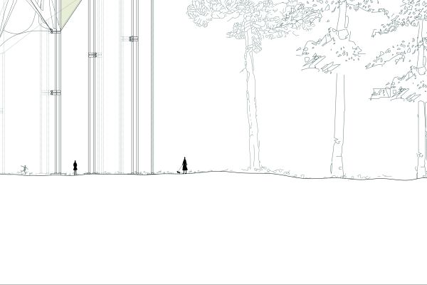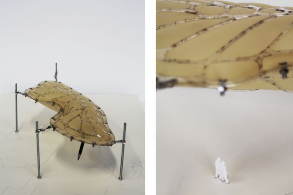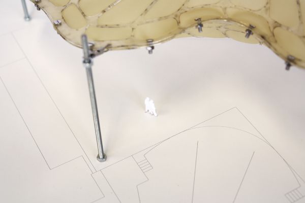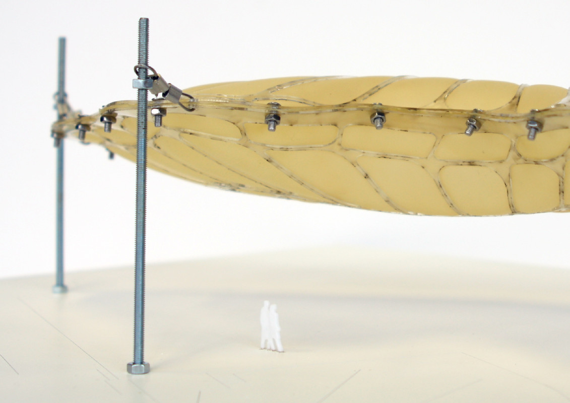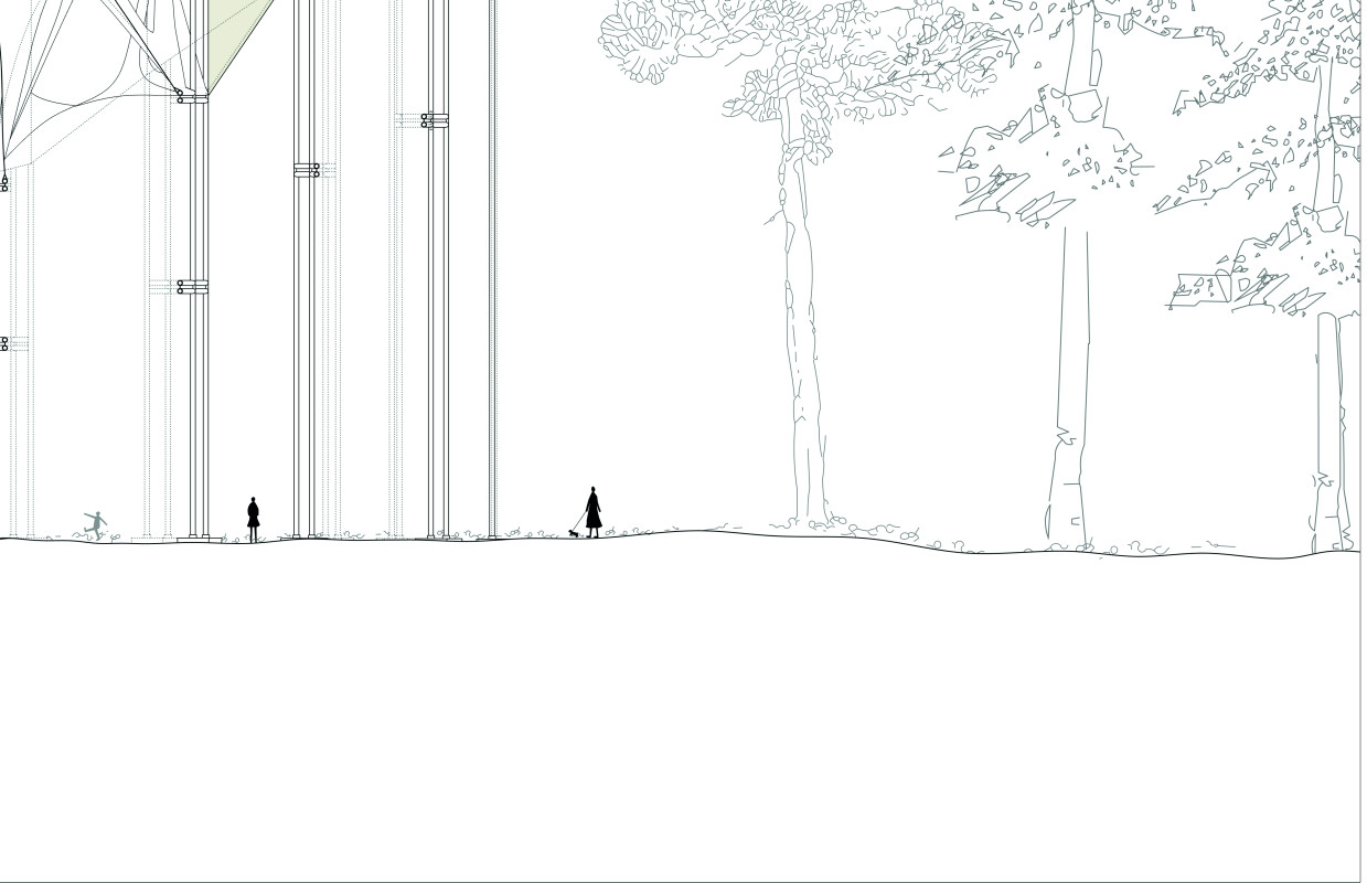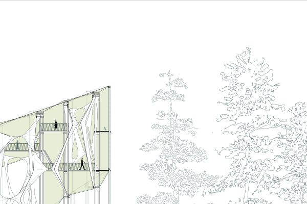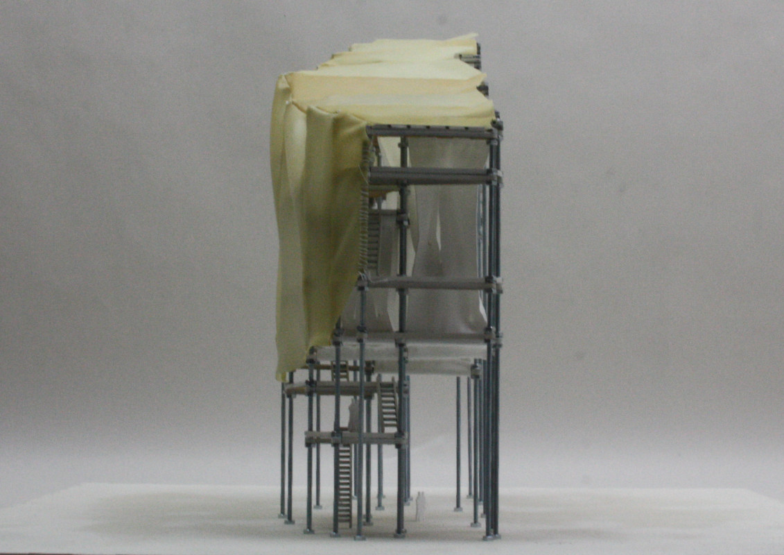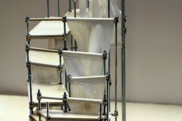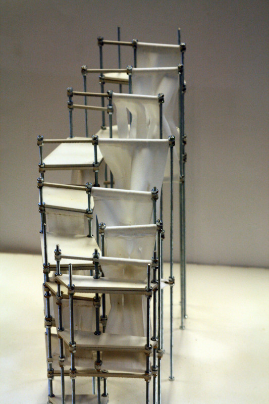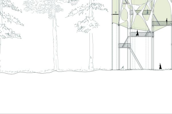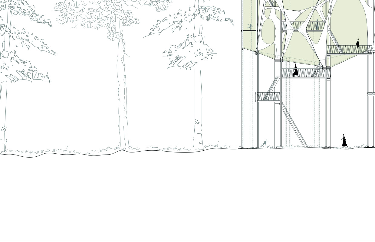 Am Ende einer Vielzahl von Modellstudien steht eine begehbare Struktur im Wald. Zwischen vertikalen Rundrohren spannen sich Stoffbahnen auf, die durch punktuelles Vernähen miteinander verschmelzen. Die seitlich angeordneten Ebenen verspringen im Schnitt. Über Leitern gelangt man von einer Ebene zur nächsten. Ein lineares Durchschreiten ist allerdings nicht möglich, vielmehr muss man sich den Weg suchen. Bei Dunkelheit werden die Stoffverspannungen durch eine Lichtquelle im Inneren auf die Außenhaut projiziert. Jenachdem wie die Lichtquellen platziert sind, variiert der Grad der Verzerrung.