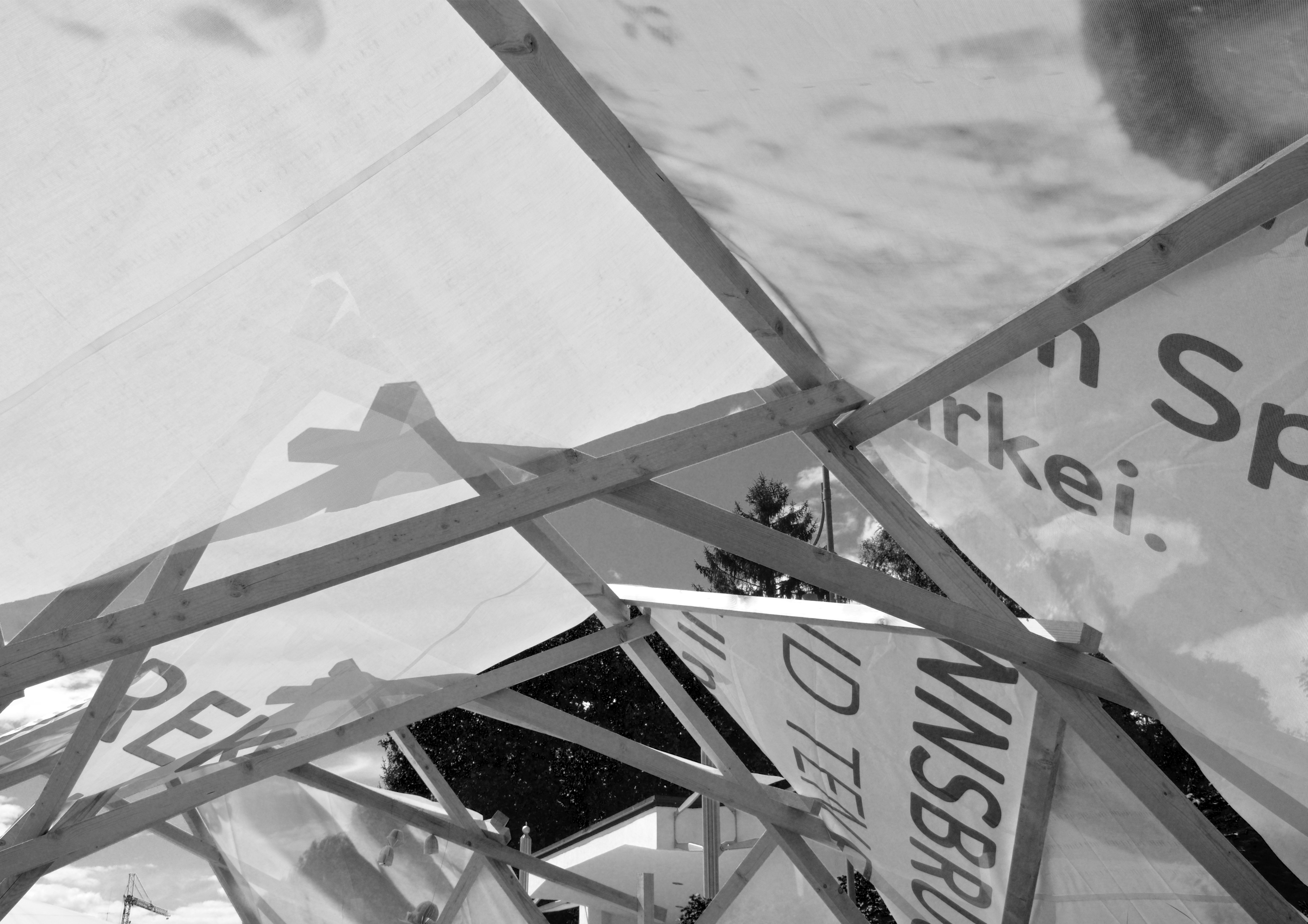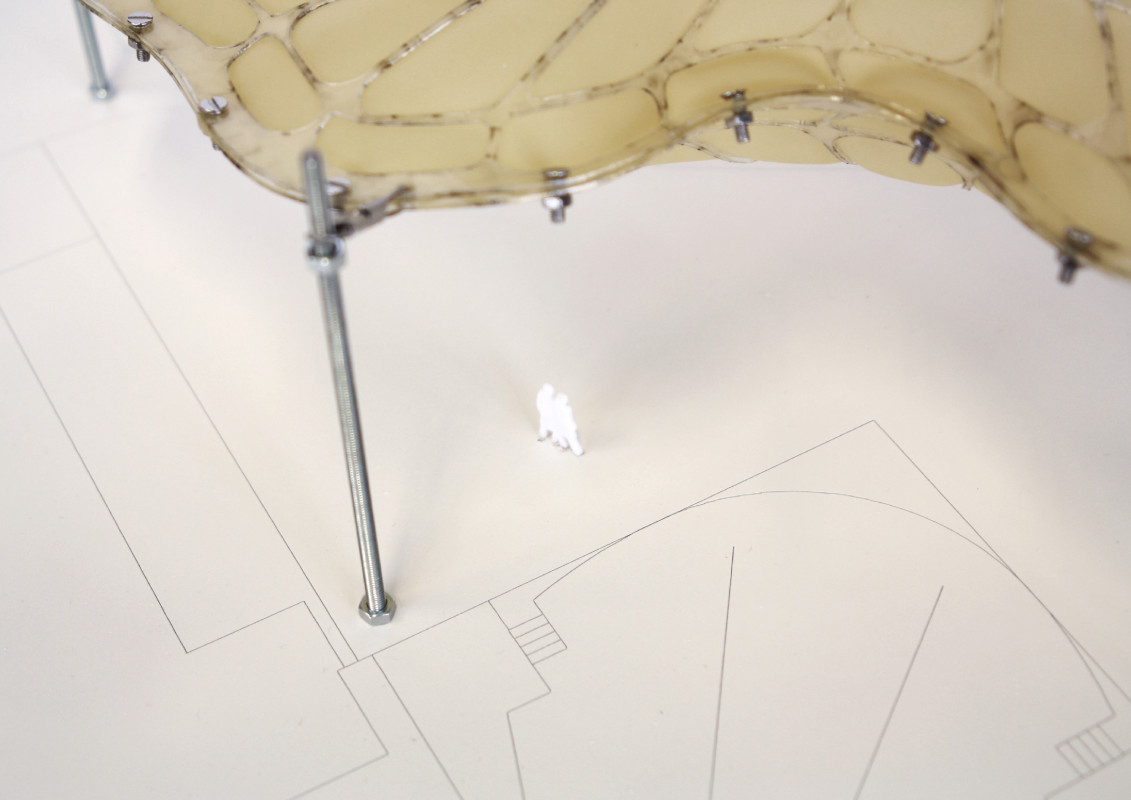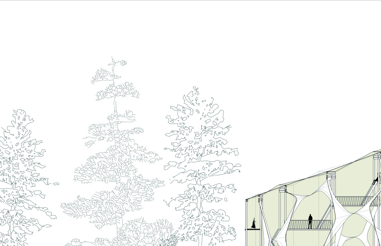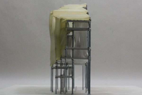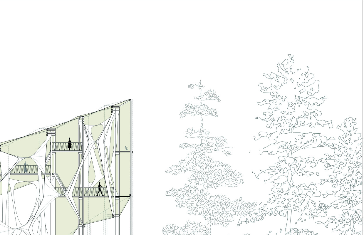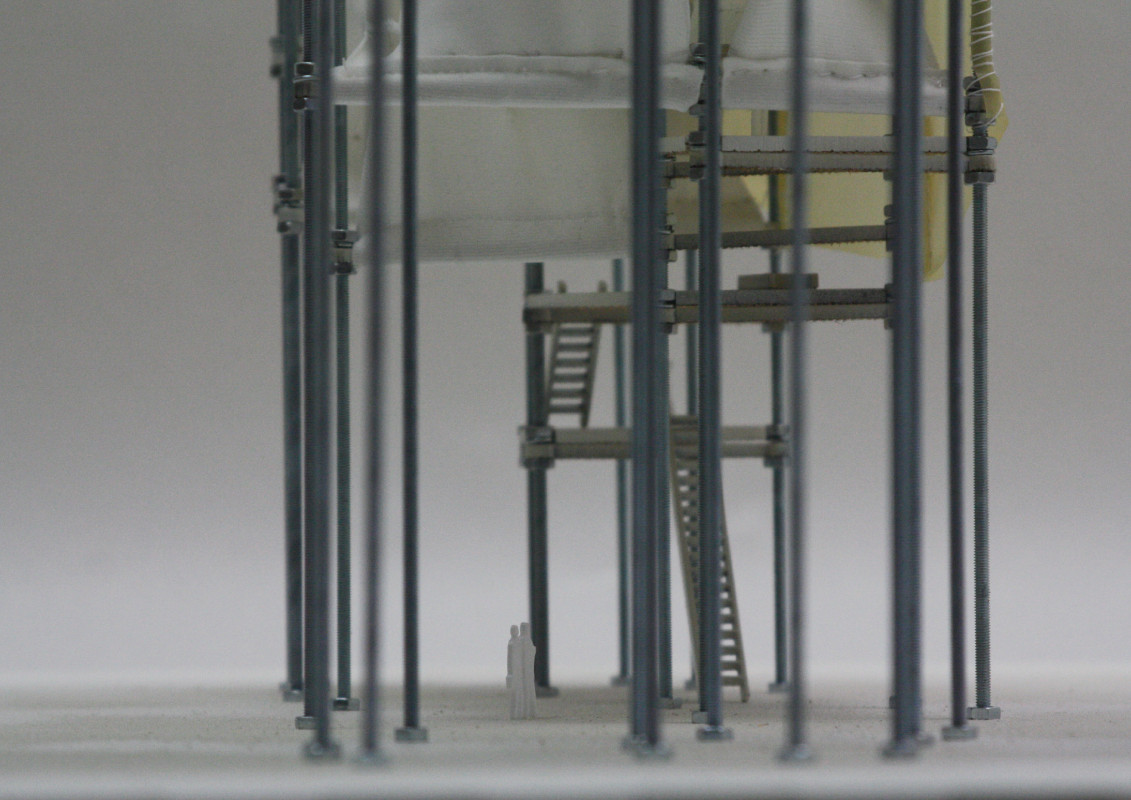 Am Ende einer Vielzahl von Modellstudien steht eine begehbare Struktur im Wald. Zwischen vertikalen Rundrohren spannen sich Stoffbahnen auf, die durch punktuelles Vernähen miteinander verschmelzen. Die seitlich angeordneten Ebenen verspringen im Schnitt. Über Leitern gelangt man von einer Ebene zur nächsten. Ein lineares Durchschreiten ist allerdings nicht möglich, vielmehr muss man sich den Weg suchen. Bei Dunkelheit werden die Stoffverspannungen durch eine Lichtquelle im Inneren auf die Außenhaut projiziert. Jenachdem wie die Lichtquellen platziert sind, variiert der Grad der Verzerrung.