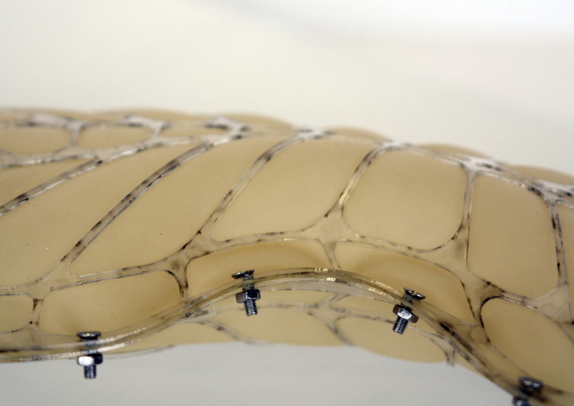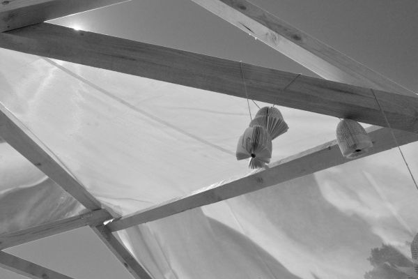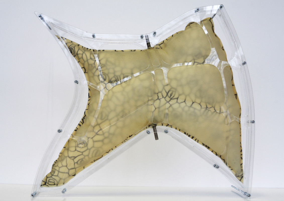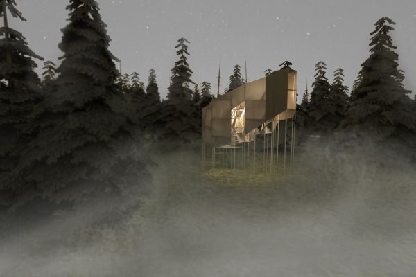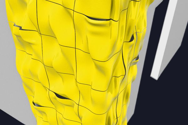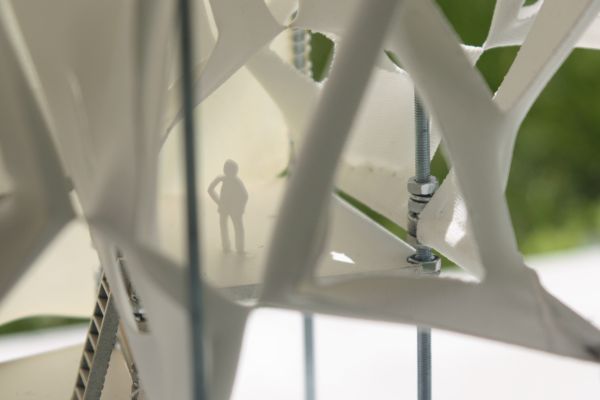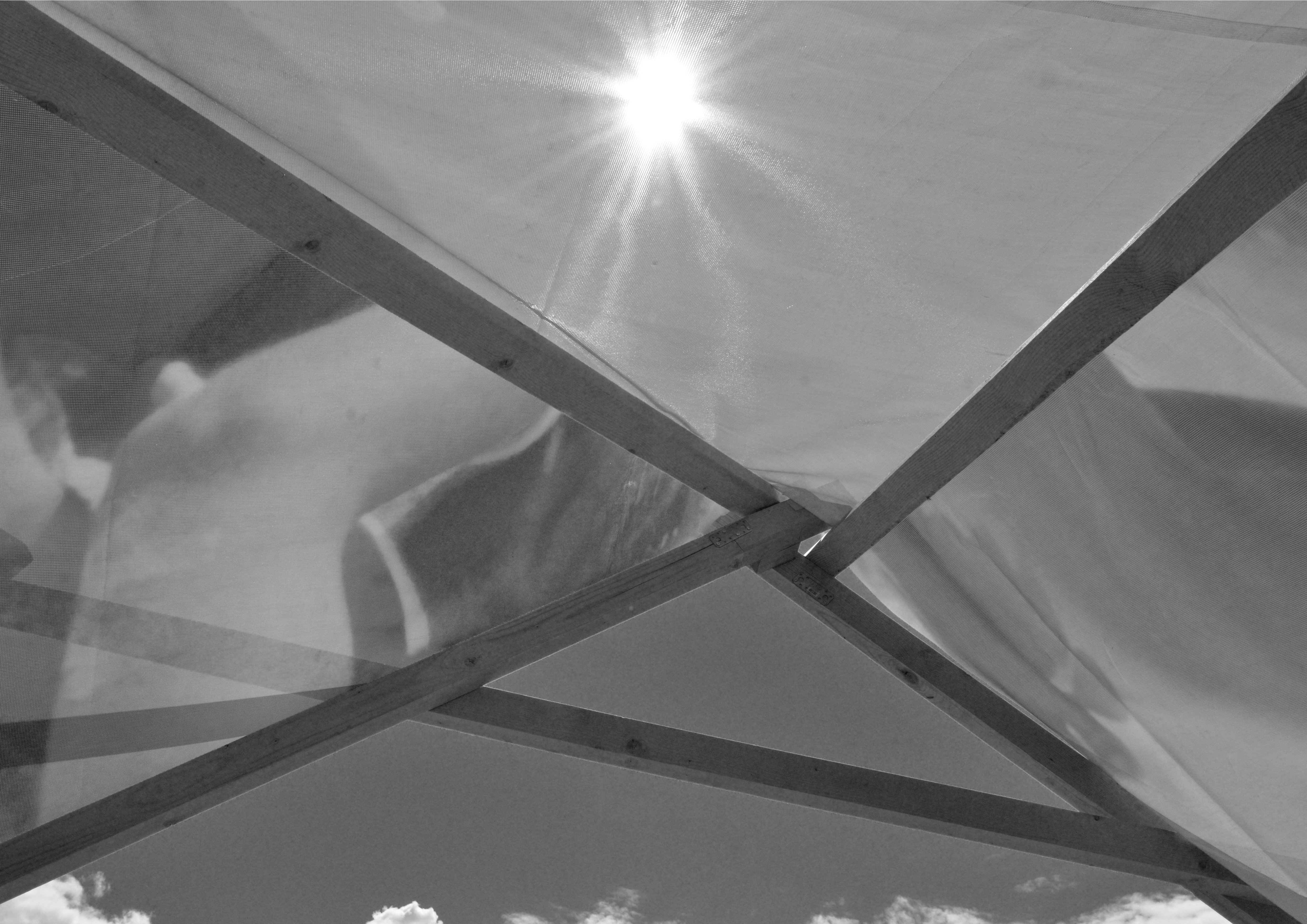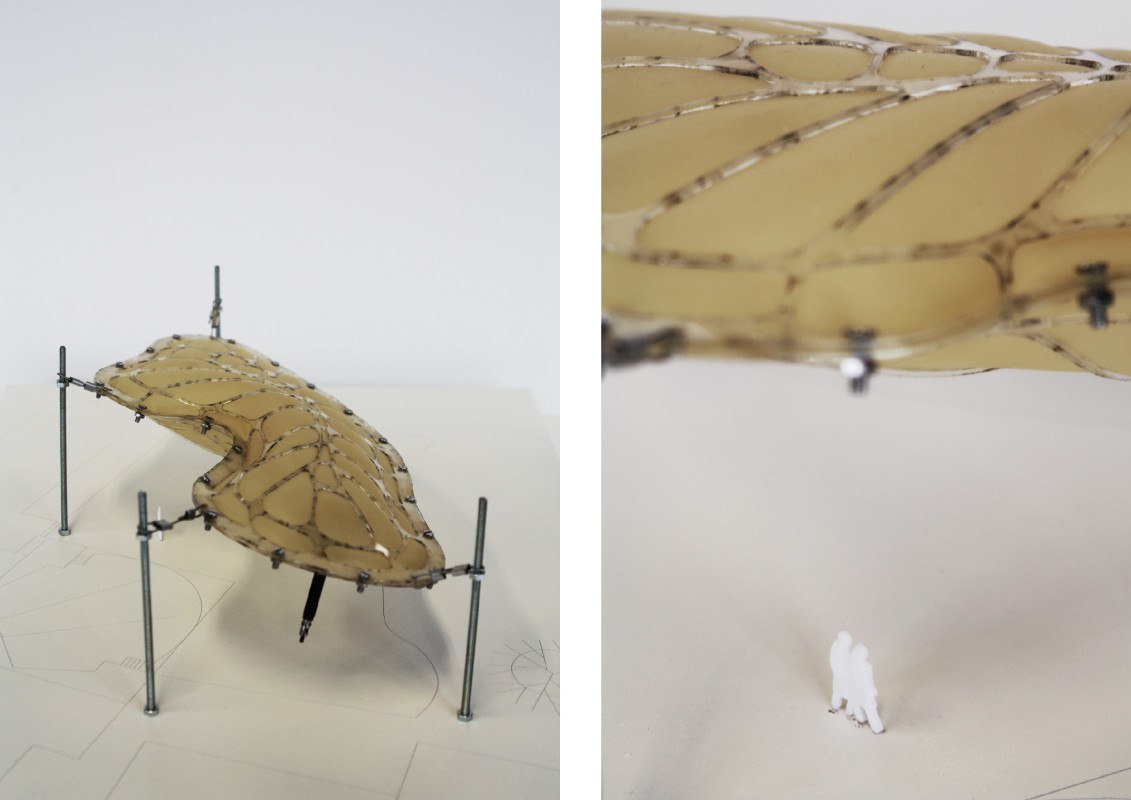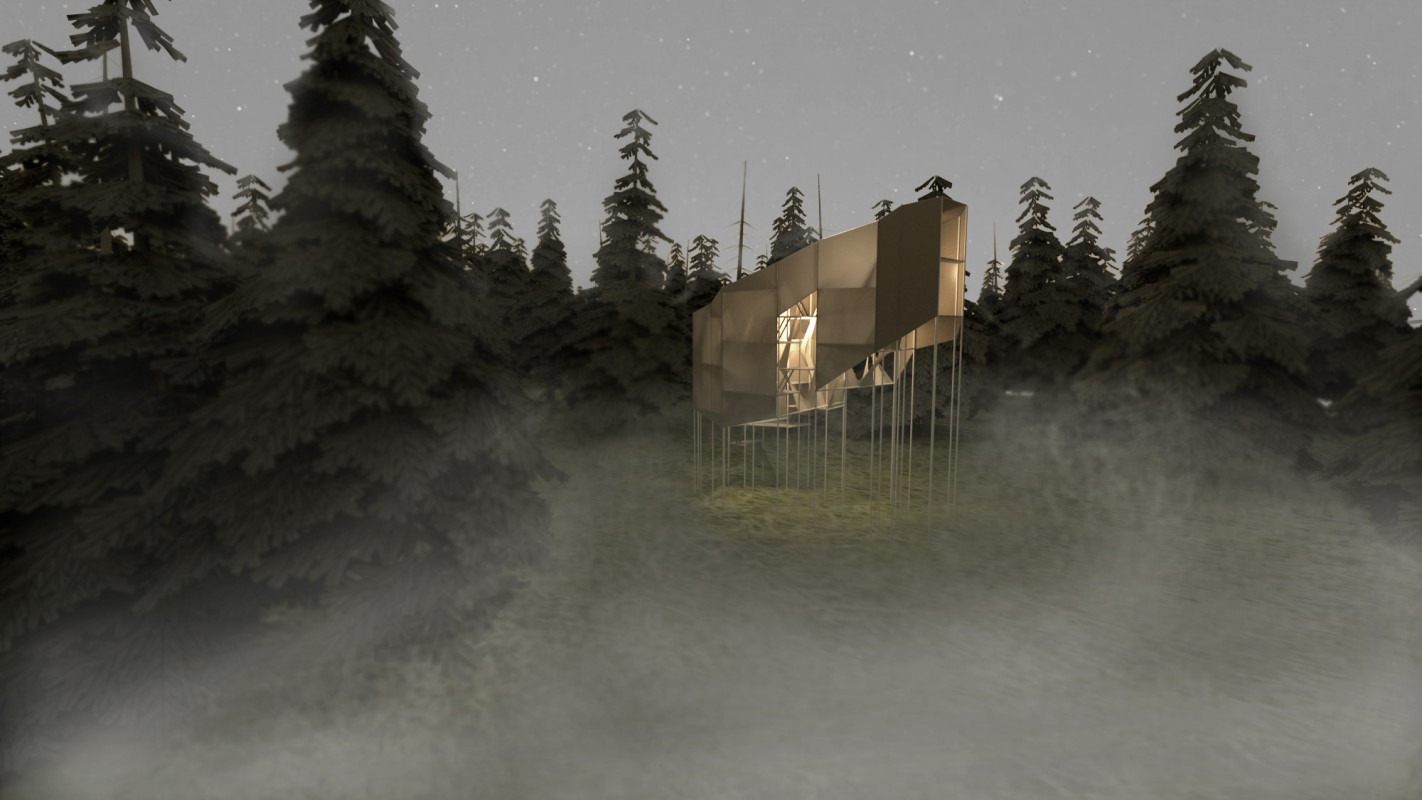 Am Ende einer Vielzahl von Modellstudien steht eine begehbare Struktur im Wald. Zwischen vertikalen Rundrohren spannen sich Stoffbahnen auf, die durch punktuelles Vernähen miteinander verschmelzen. Die seitlich angeordneten Ebenen verspringen im Schnitt. Über Leitern gelangt man von einer Ebene zur nächsten. Ein lineares Durchschreiten ist allerdings nicht möglich, vielmehr muss man sich den Weg suchen. Bei Dunkelheit werden die Stoffverspannungen durch eine Lichtquelle im Inneren auf die Außenhaut projiziert. Jenachdem wie die Lichtquellen platziert sind, variiert der Grad der Verzerrung.