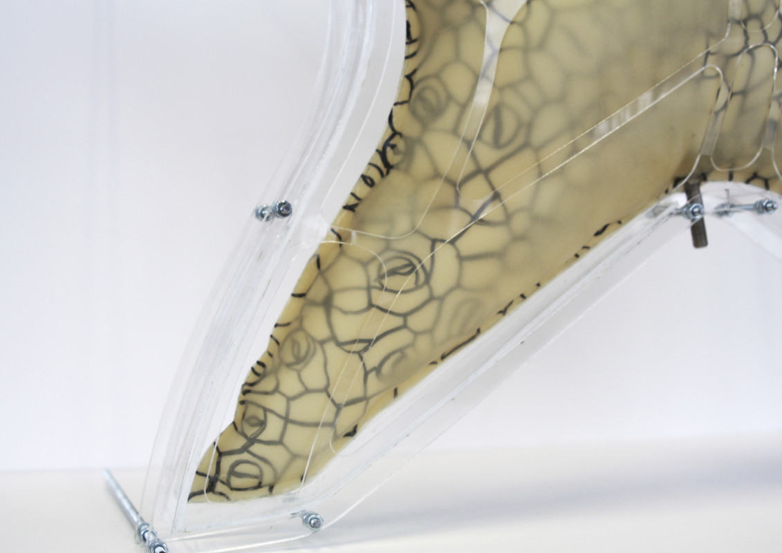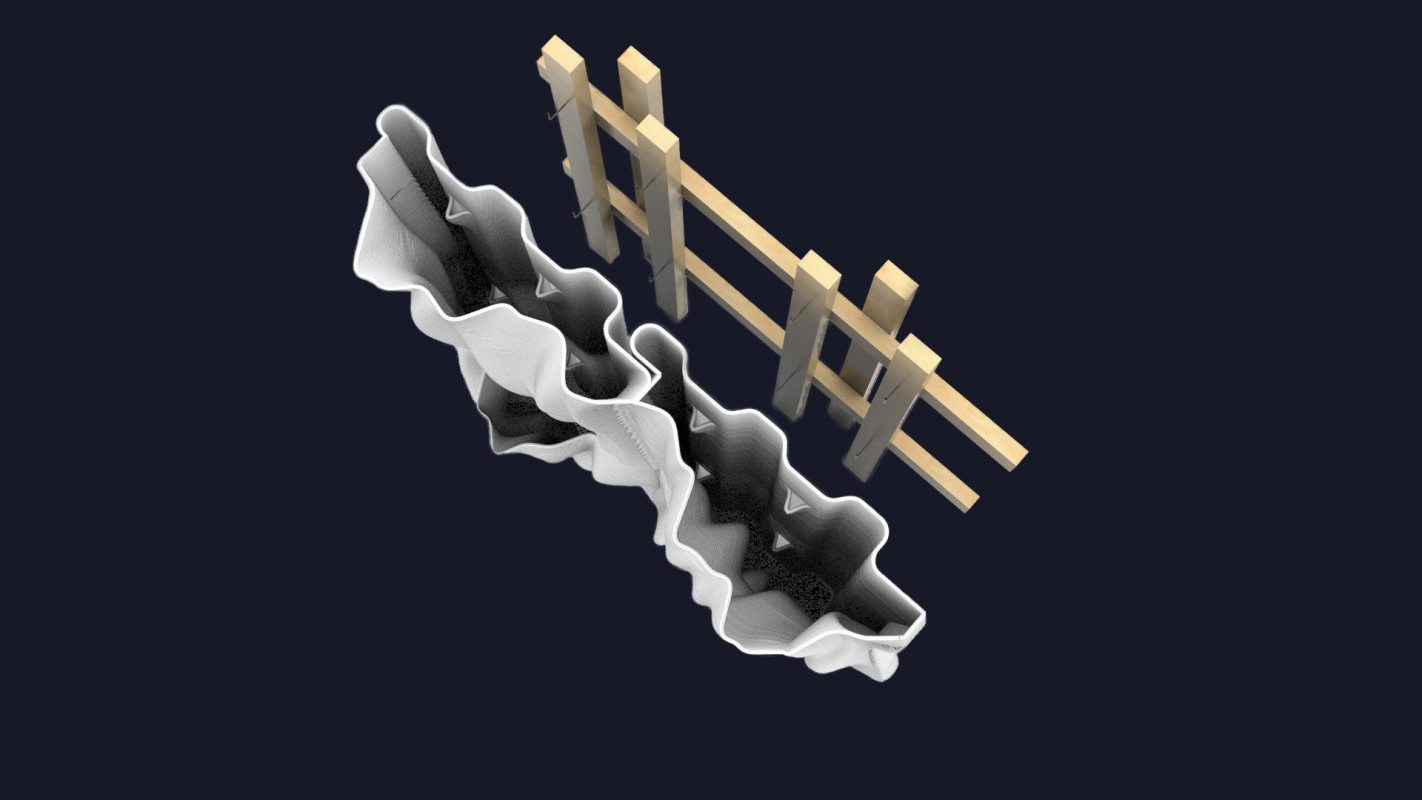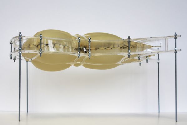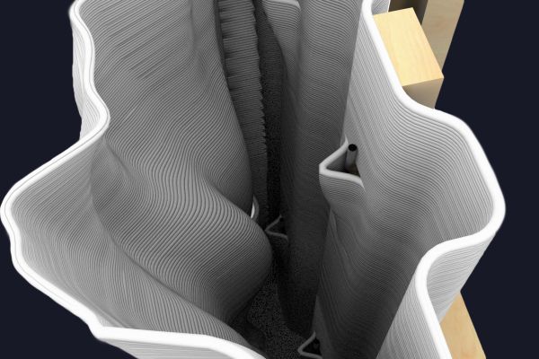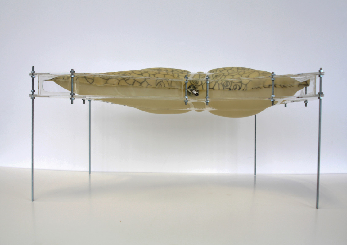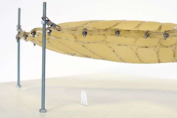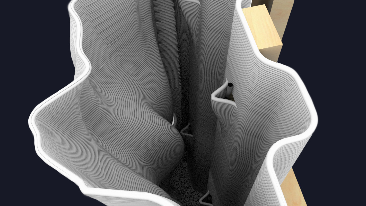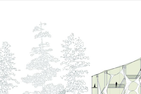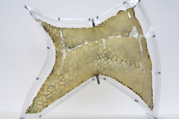 Am Ende einer Vielzahl von Modellstudien steht eine begehbare Struktur im Wald. Zwischen vertikalen Rundrohren spannen sich Stoffbahnen auf, die durch punktuelles Vernähen miteinander verschmelzen. Die seitlich angeordneten Ebenen verspringen im Schnitt. Über Leitern gelangt man von einer Ebene zur nächsten. Ein lineares Durchschreiten ist allerdings nicht möglich, vielmehr muss man sich den Weg suchen. Bei Dunkelheit werden die Stoffverspannungen durch eine Lichtquelle im Inneren auf die Außenhaut projiziert. Jenachdem wie die Lichtquellen platziert sind, variiert der Grad der Verzerrung.