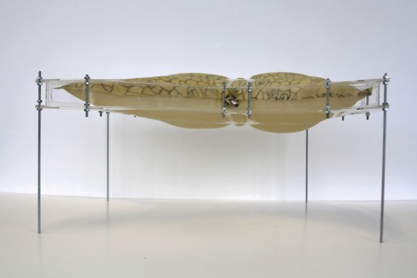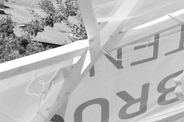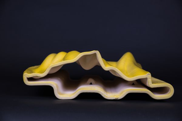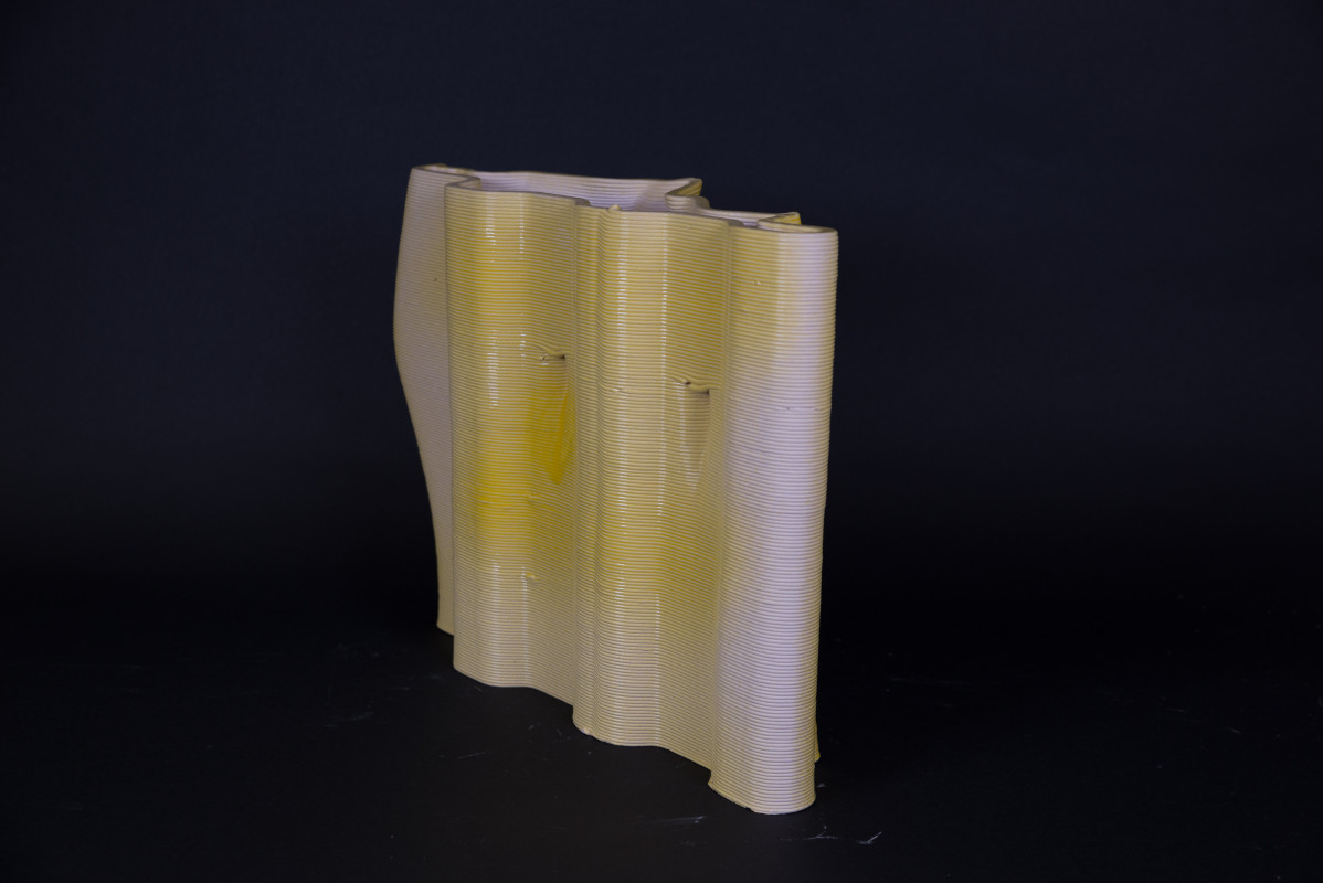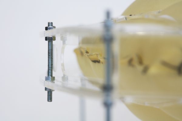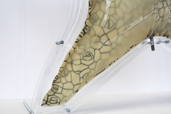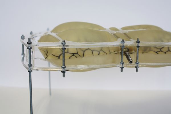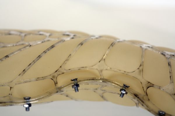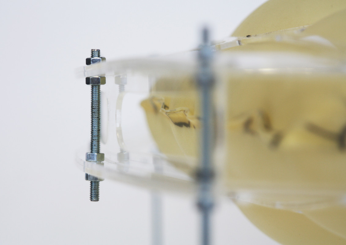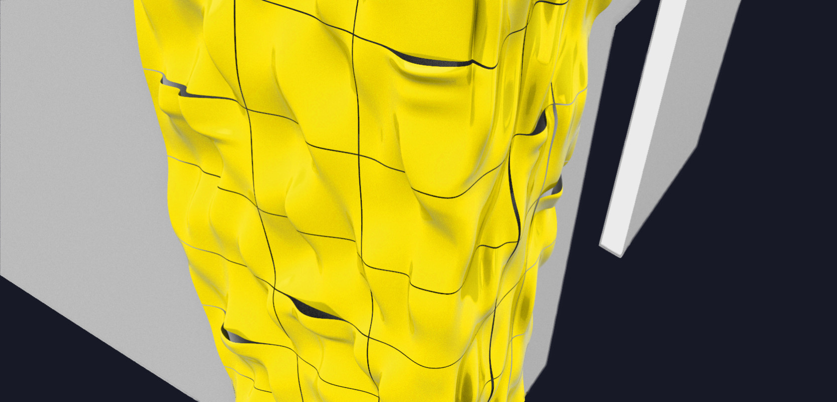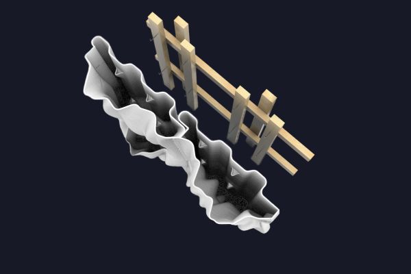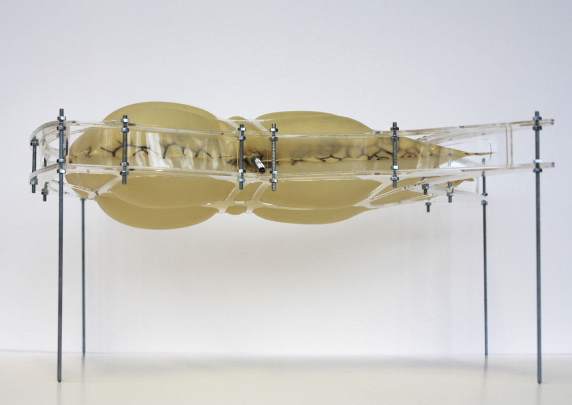 Am Ende einer Vielzahl von Modellstudien steht eine begehbare Struktur im Wald. Zwischen vertikalen Rundrohren spannen sich Stoffbahnen auf, die durch punktuelles Vernähen miteinander verschmelzen. Die seitlich angeordneten Ebenen verspringen im Schnitt. Über Leitern gelangt man von einer Ebene zur nächsten. Ein lineares Durchschreiten ist allerdings nicht möglich, vielmehr muss man sich den Weg suchen. Bei Dunkelheit werden die Stoffverspannungen durch eine Lichtquelle im Inneren auf die Außenhaut projiziert. Jenachdem wie die Lichtquellen platziert sind, variiert der Grad der Verzerrung.