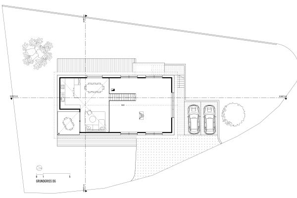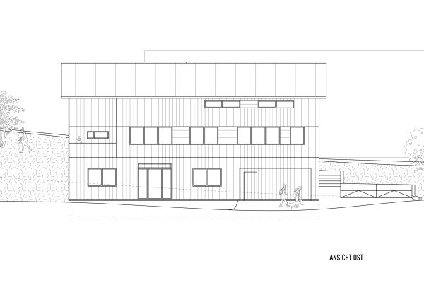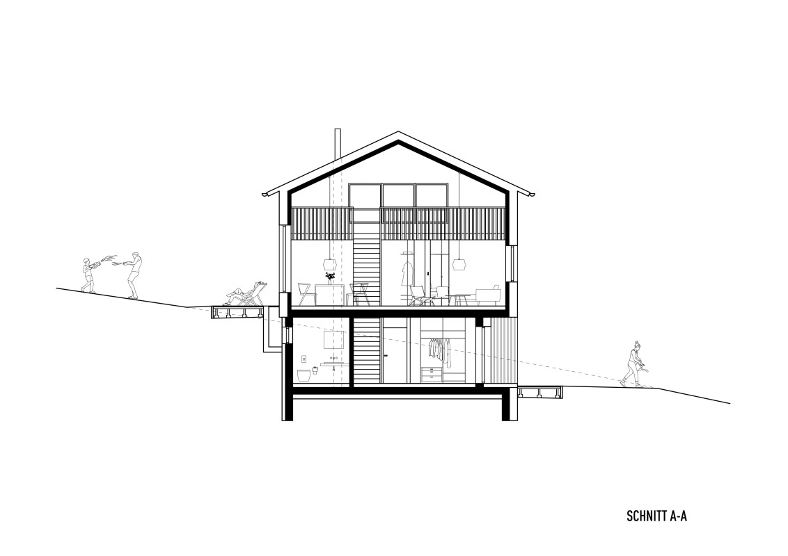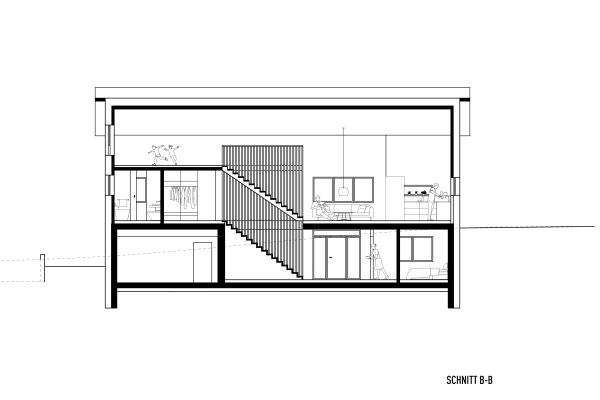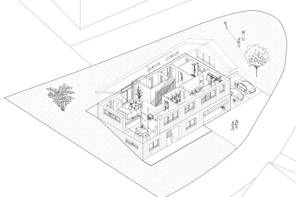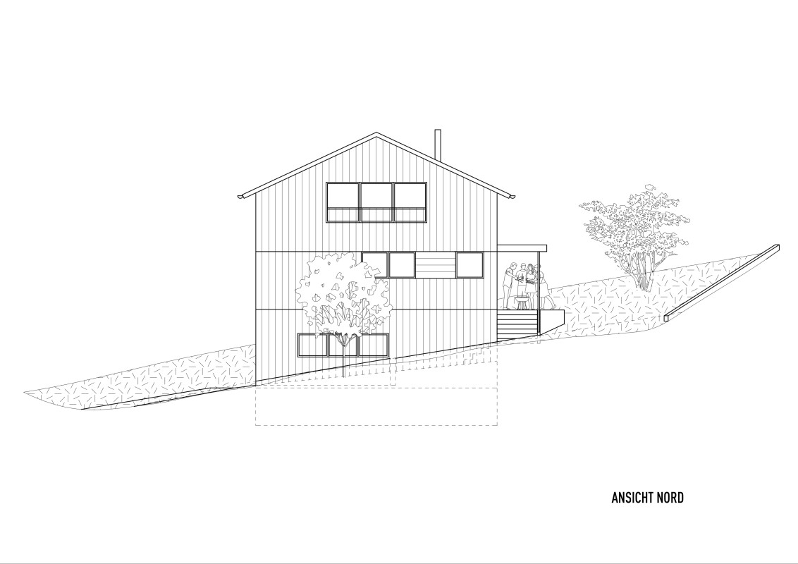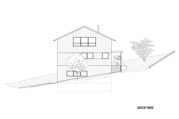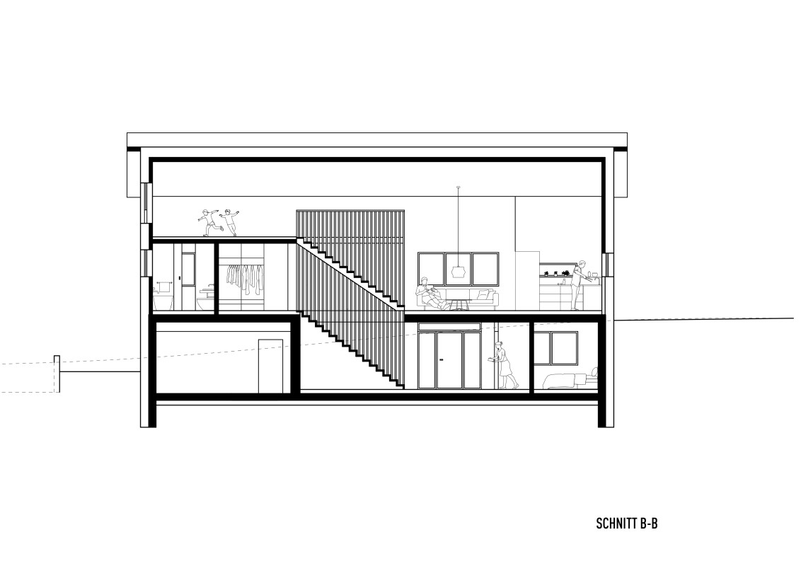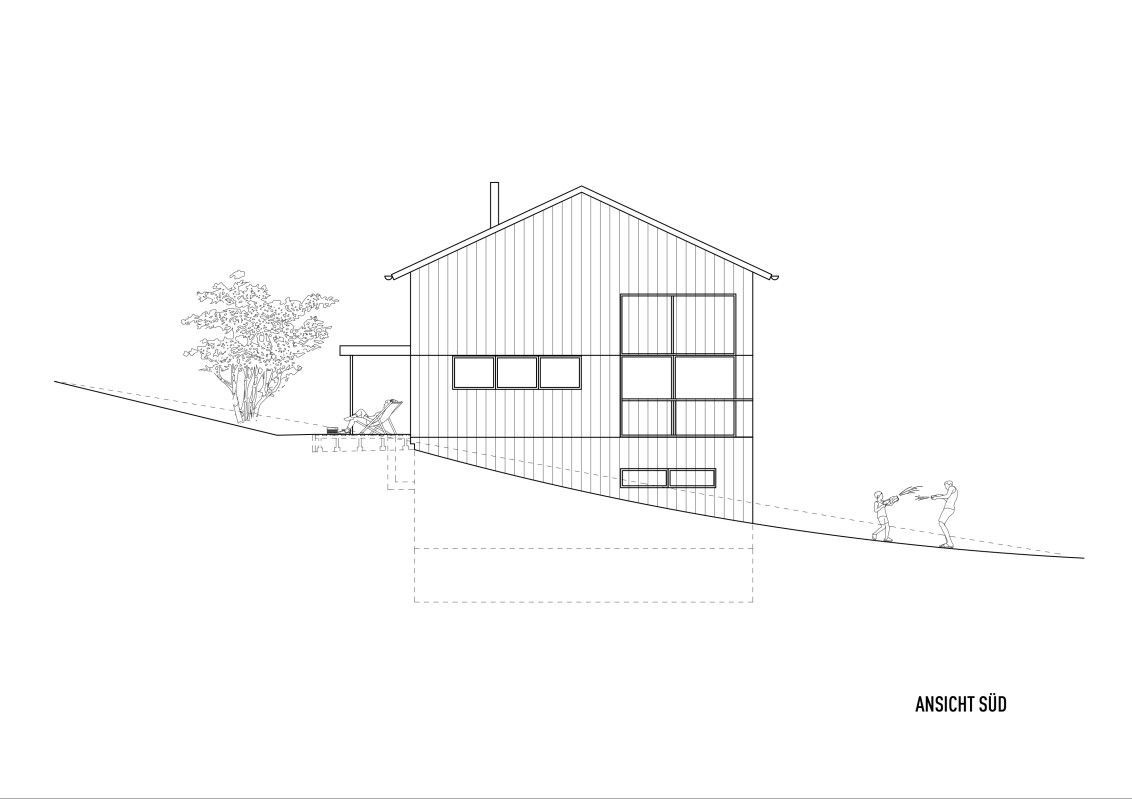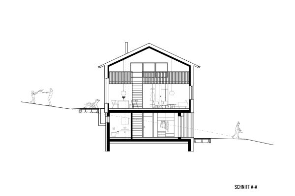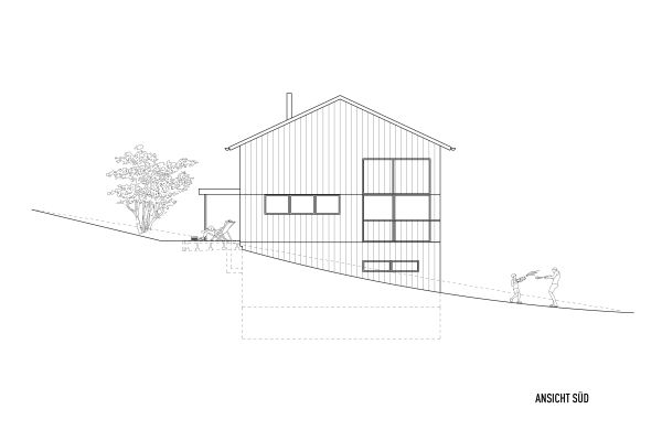 Das Grundstück befindet sich an einem nach Nordosten abfallenden Hang mit Blick in den vorderen Bregenzerwald. Zunächst wird die wachsenden Familie das Haus wahrscheinlich alleine bewohnen. Je nach Bedarf kann das Erdgeschoss jedoch als seperate Wohnung ausgebaut werden. Das Dachgeschoss, in Form von einer großzügigen Galerie, bietet einen flexiblen Raum für unterschiedlichste Nutzungen, der jederzeit in kleinere Räume unterteilt werden kann. Das EG wurde wegen der Hanglage in Beton ausgeführt, das OG und DG konnten in Holzmassivbauweise realisiert werden.