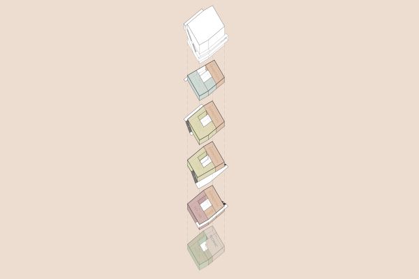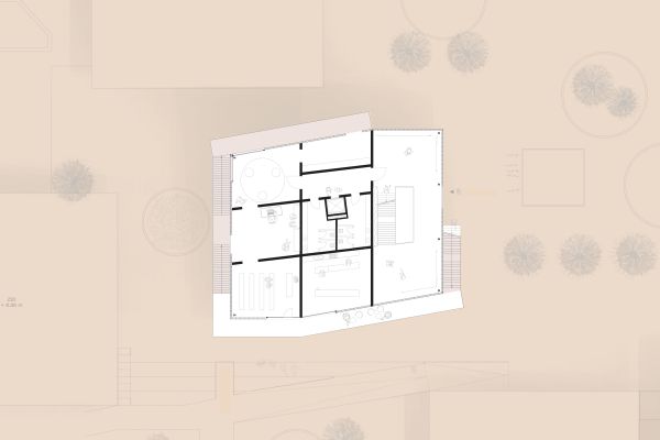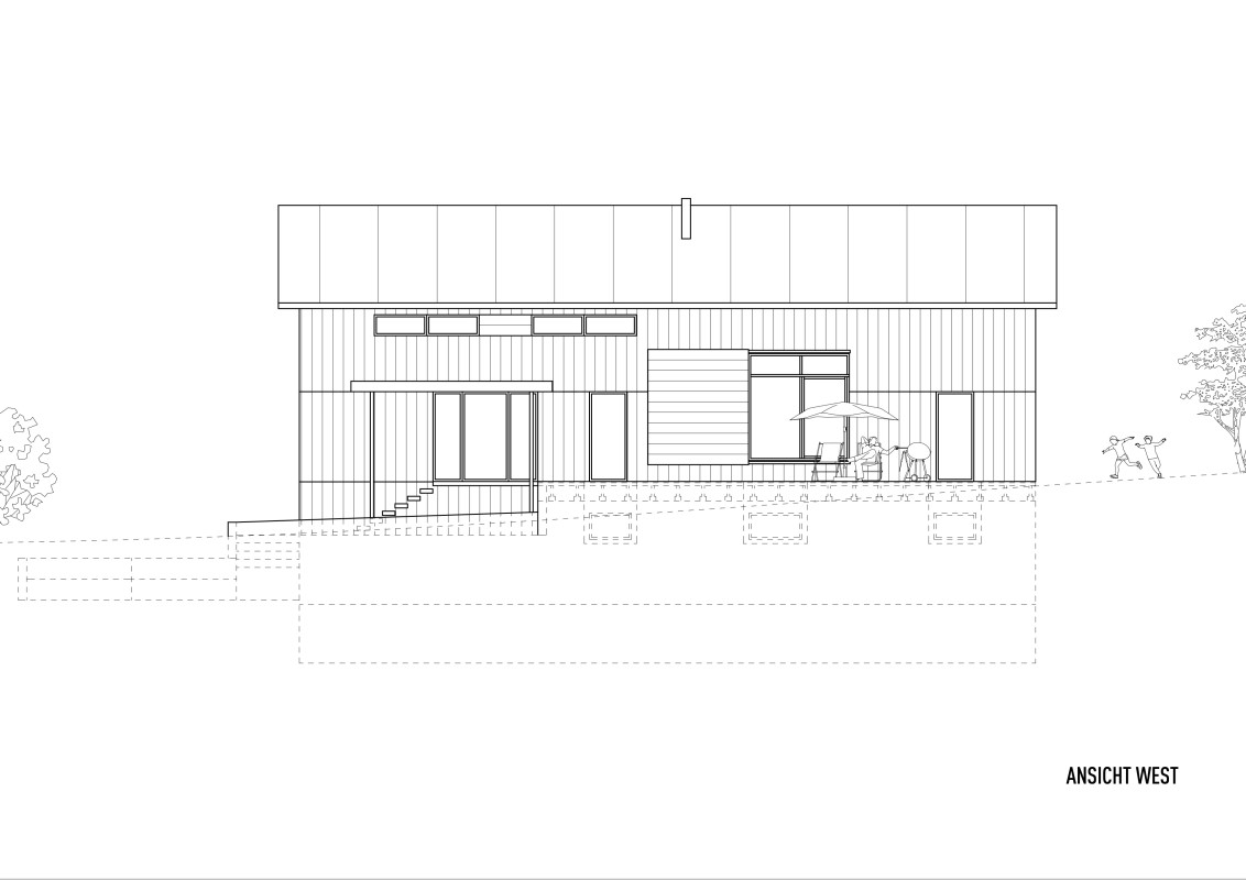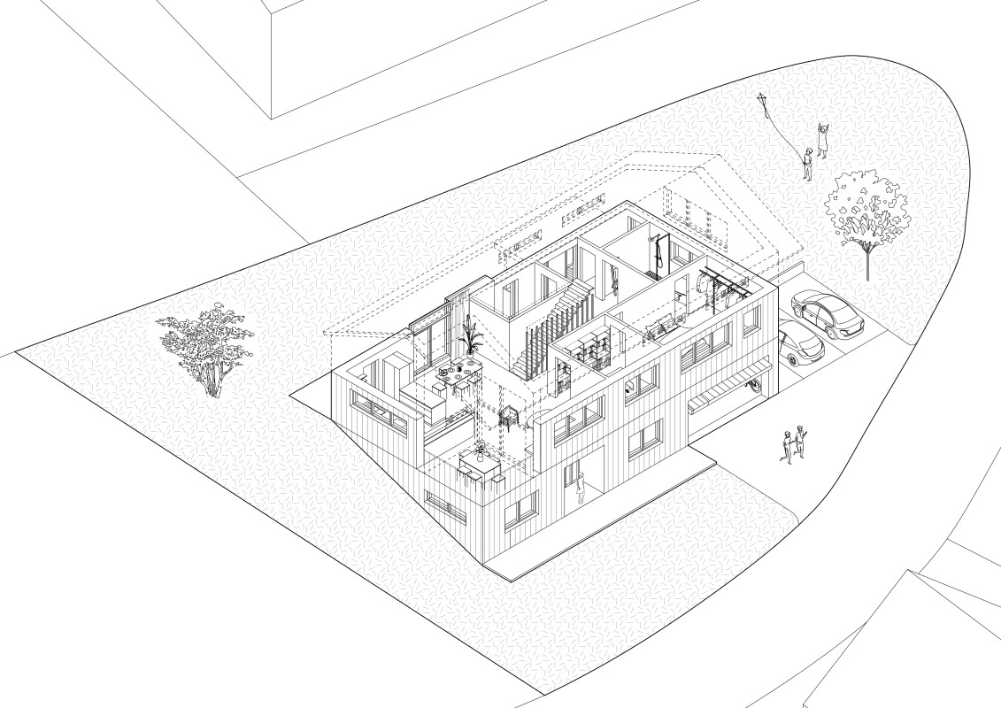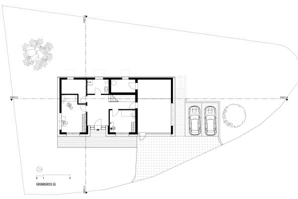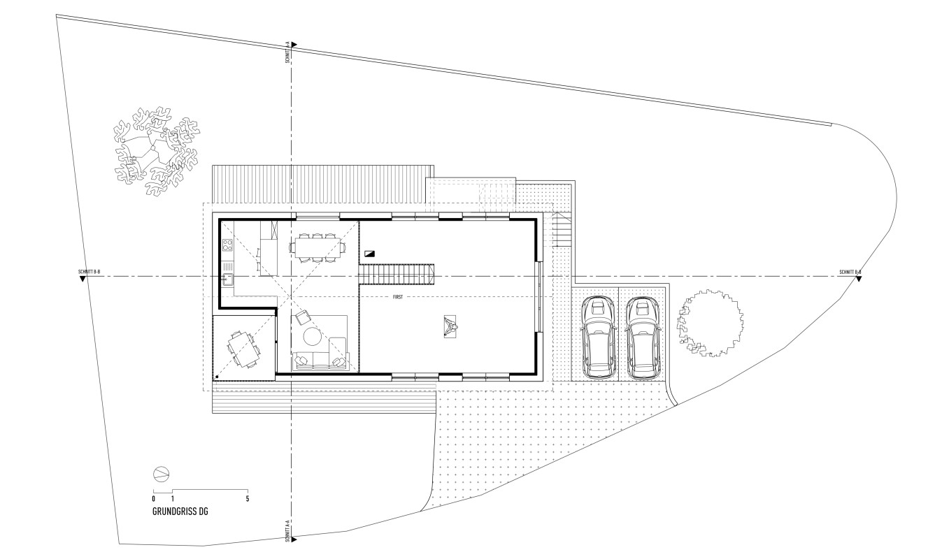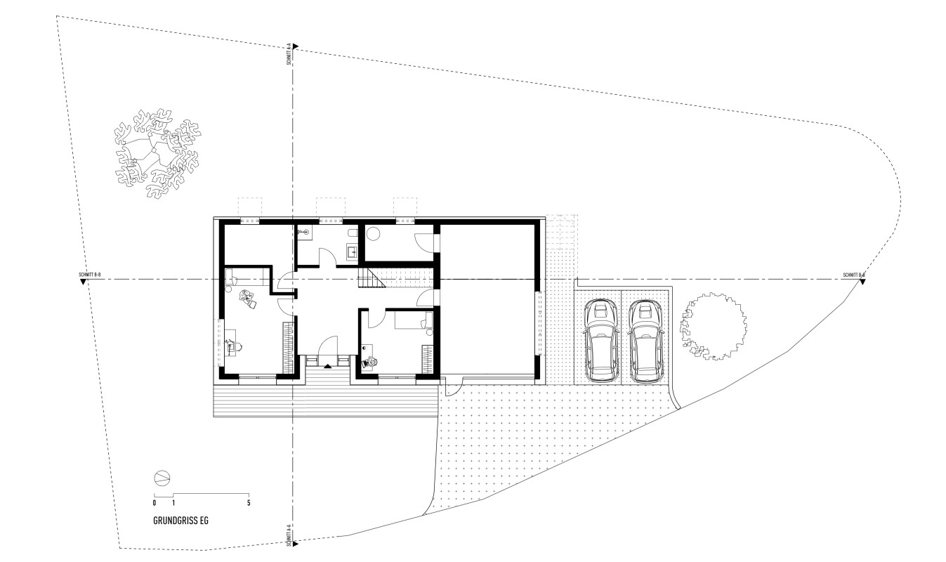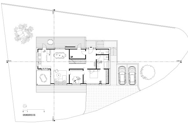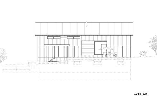 Das Grundstück befindet sich an einem nach Nordosten abfallenden Hang mit Blick in den vorderen Bregenzerwald. Zunächst wird die wachsenden Familie das Haus wahrscheinlich alleine bewohnen. Je nach Bedarf kann das Erdgeschoss jedoch als seperate Wohnung ausgebaut werden. Das Dachgeschoss, in Form von einer großzügigen Galerie, bietet einen flexiblen Raum für unterschiedlichste Nutzungen, der jederzeit in kleinere Räume unterteilt werden kann. Das EG wurde wegen der Hanglage in Beton ausgeführt, das OG und DG konnten in Holzmassivbauweise realisiert werden.