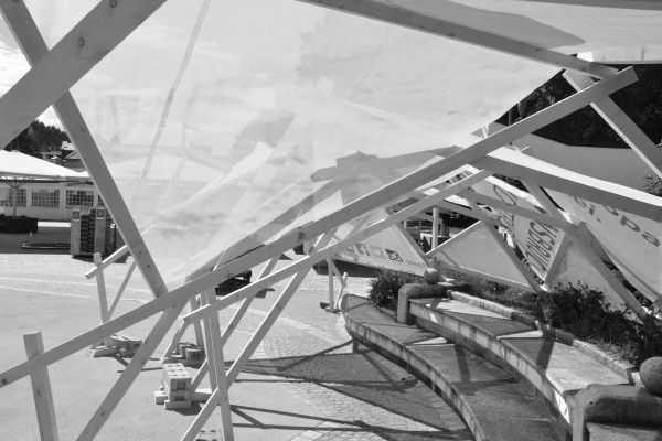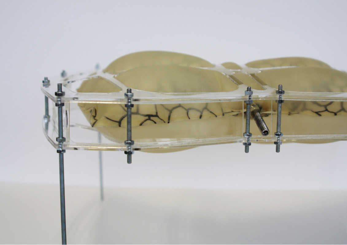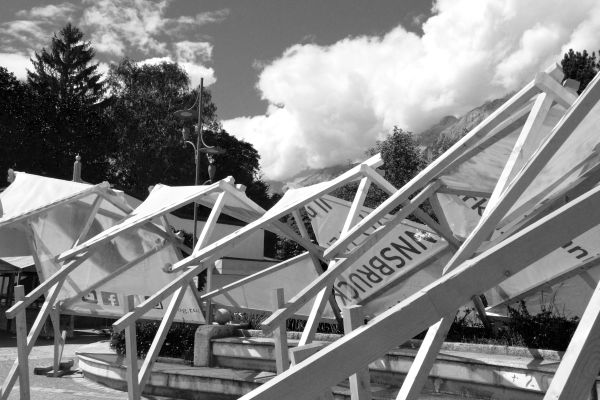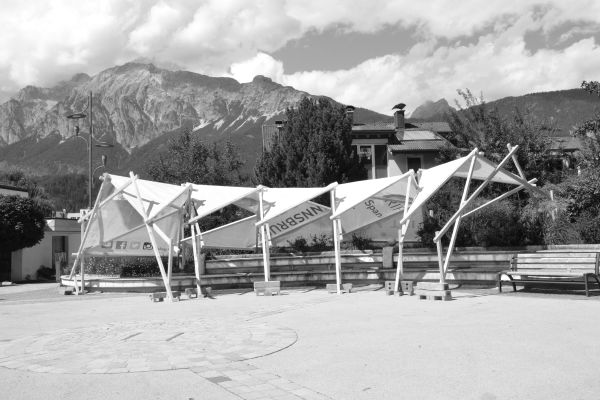 Die pneumatische Überdachung „Under Pressure“ wurde speziell für die Anforderungen des Vorplatzes des Musikpavillions in Prutz, Tirol, entwickelt. Ein stützenfreier Blick zur Bühne, eine gute Akustik und die Möglichkeit des Auf - und Abbaus standen im Zentrum des Entwurfsprozesses. Die Überdachung besteht aus drei Luftkissen mit je zwei Luftkammern, die aus thermoplastischem Polyurethan gefertigt werden. Eingehüllt in eine formgebenden Struktur aus Segeltuch werden die drei Segmente zusammengeschlossen und an vier, vor Ort installierte Stützen, angehängt. Die Aufhängung erfolgt über Stahlseile und Ösen an einem Kurbelpfosten aus Edelstahl. Bevor das gesamte Luftkissen in die Höhe gehisst wird, muss die Luftzufuhr an jede der sechs Kammern angeschlossen werden. Durch die sechs Luftkammern, drei an der Ober- und drei an der Unterseite, kann die Akustik vor Ort angepasst werden. Durch die Zufuhr von Stickstoff ist es möglich einen Nebel in den Luftkammern zu erzeugen, was für die Beschattung sorgt.